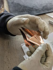 銅板に写し、へらでしっかり押し出し 液に着けて良い感じに色がついたら